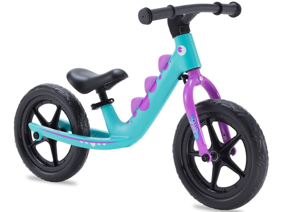 12-palcový vyvažovací bicykel EVA RoyalBaby je ľahká a pohodlná jazda v modrej a ružovej farbe s dinosaurím motívom.