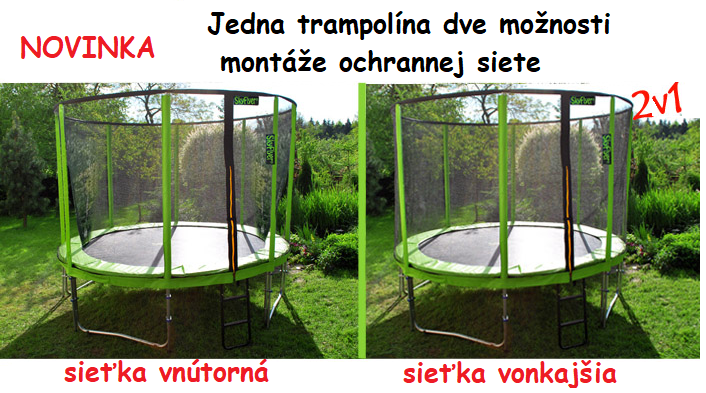 Možnosť inštalácie ochrannej siete dvoma spôsobmi. Vďaka tomu získavame trampolínu s vnútornou sieťkou (pre malé deti) a vonkajšou sieťkou pre staršie deti.