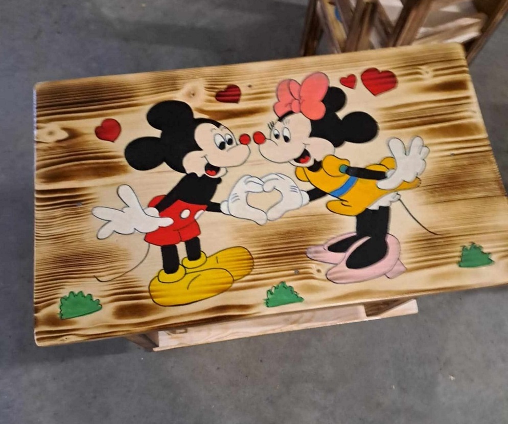 Drevený detský stolík a 2 stoličky maľovaný Mickey + Minnie