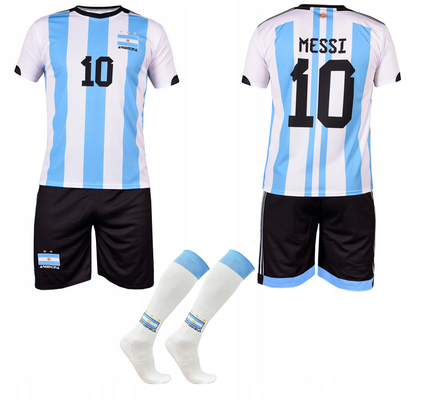 Futbalový dres so štucnami-Messi Argentína 122 so štucnami Argentínskeho národného tímu s nápisom Messi v domácej verzii.