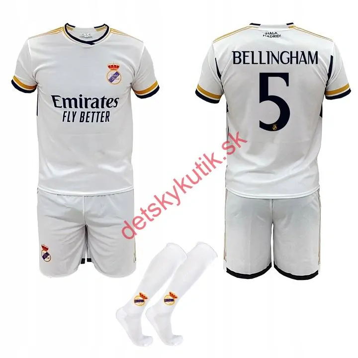 Futbalová uniforma REAL MADRID so štuckami v bielej farbe s nápisom BELLINGHAM.
